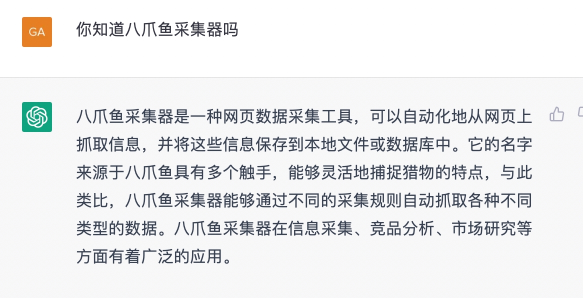 既然chatGPT知道八爪魚,那我是不是可以用它來幫我工作呢?于是我繼續(xù)問他: